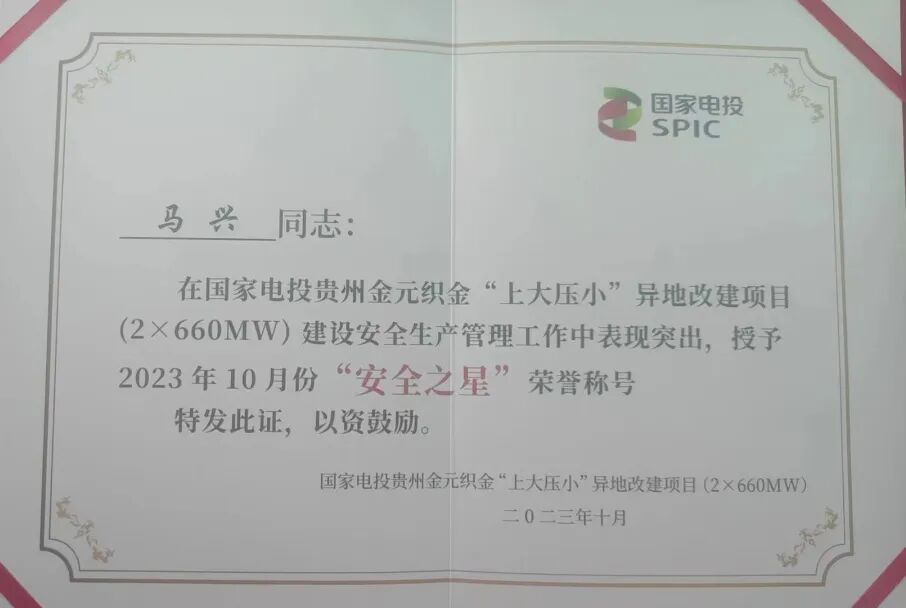 10月30日,貴州織金項目部馬興在國家電投貴州金元織金“上大壓小”異地改建項目(2*660MW)建設(shè)單位、總包、監(jiān)理、首次聯(lián)合舉辦的建設(shè)安全管理評比中, 獲得10月份“安全之星”榮譽稱號。